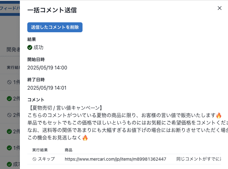 「実行履歴」タブの一括コメント送信の履歴から、一括で送信したコメントを削除することもできます。