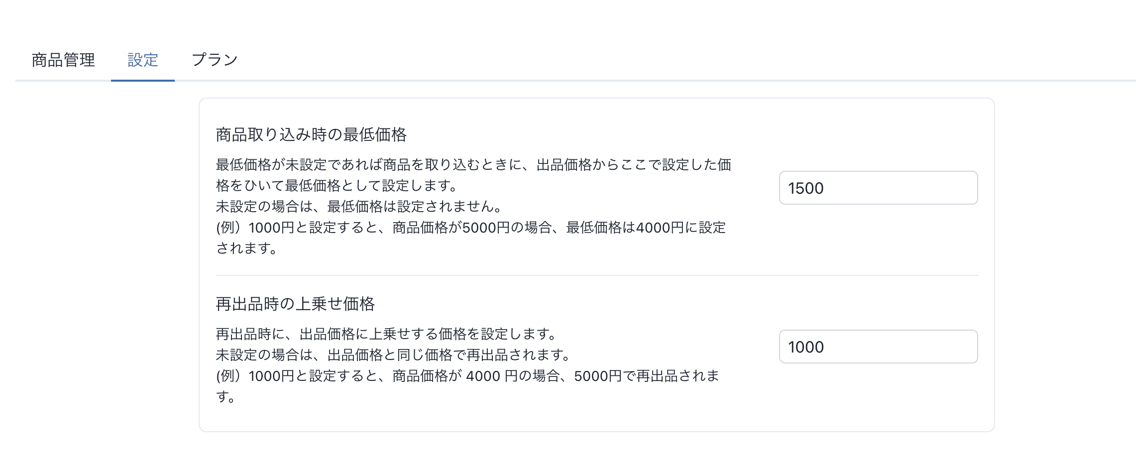 出品中の商品を取り込むときに最低価格を自動で設定できるようになりました。
