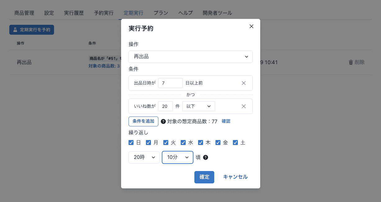 一括値下げ、再出品、一括コメント送信を時間指定して予約実行できるようにしました。
