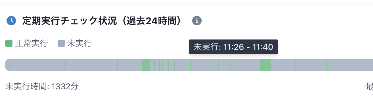 定期実行での予約した時刻にチェックがされていたか | チェック状況のバーをマウスでホバーして指定した時刻がグレー(チェック未実行)になっていないか確認する。 ![]() | グレーになっている場合は指定した時刻にPCがスリープになっている可能性があるため、スリープの設定を見直してください。 |