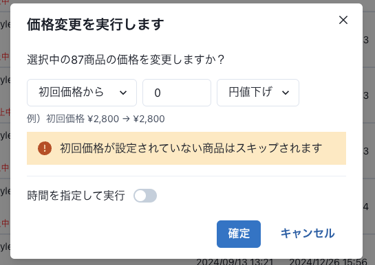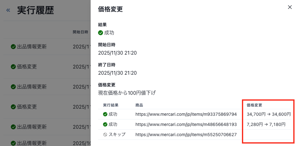 価格変更の実行履歴から、変更前と変更後の価格を確認できるようになります。