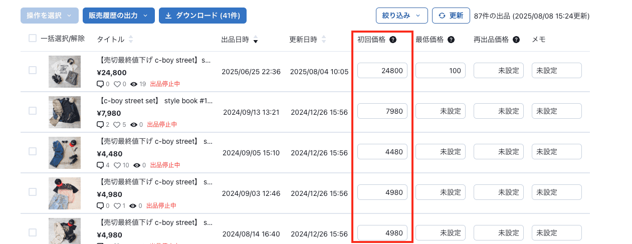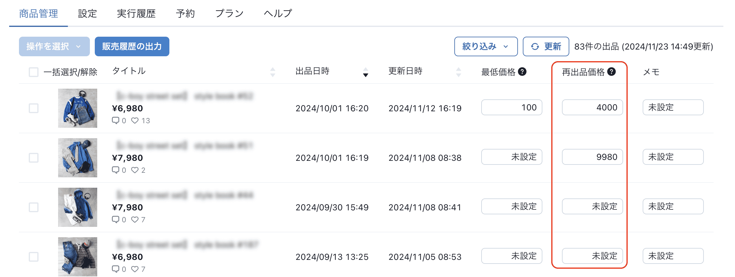 直近更新のない商品を値下げ、再出品する際にご利用ください。