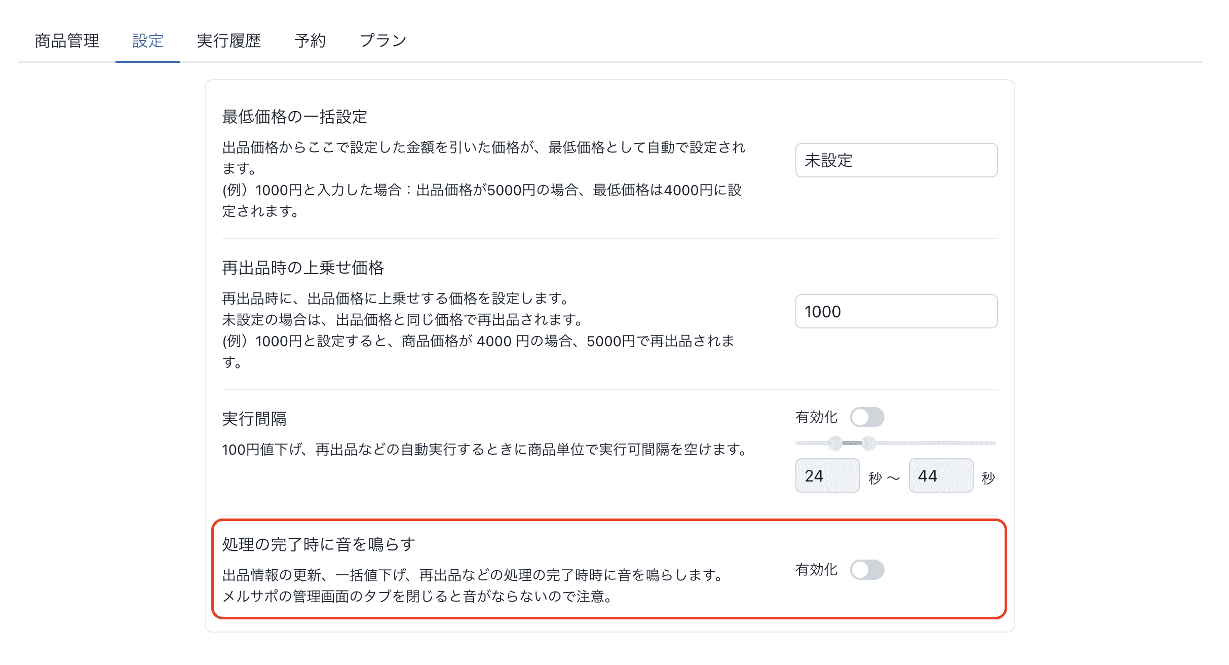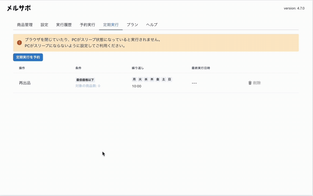 100円値下げ、再出品などの自動実行するときに商品単位で実行可間隔を空けられるようになりました。