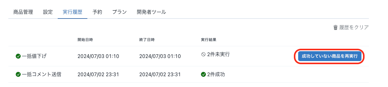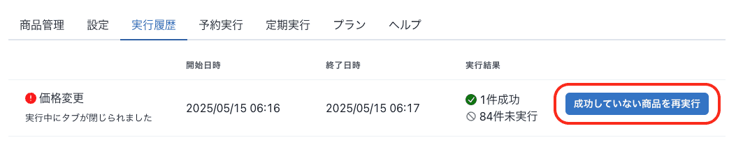 - 実行履歴から価格変更の成功しなかった商品を再実行すると、成功した商品も含まれる不具合の修正