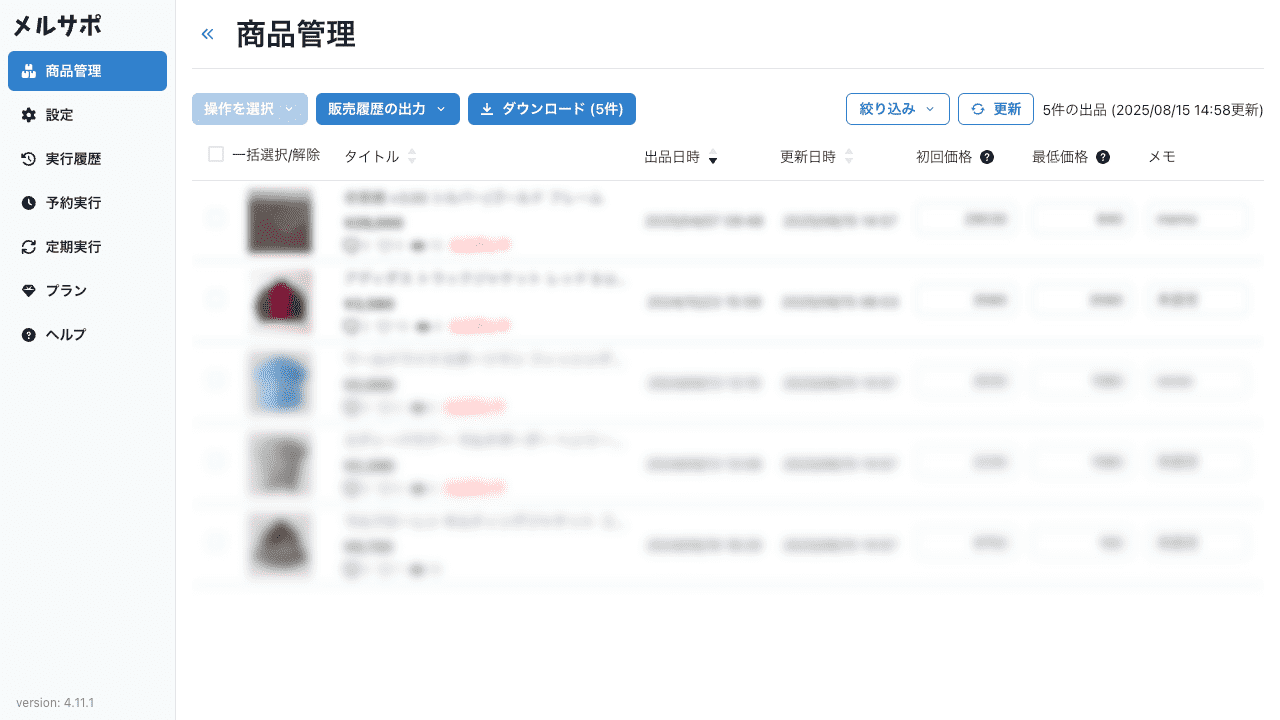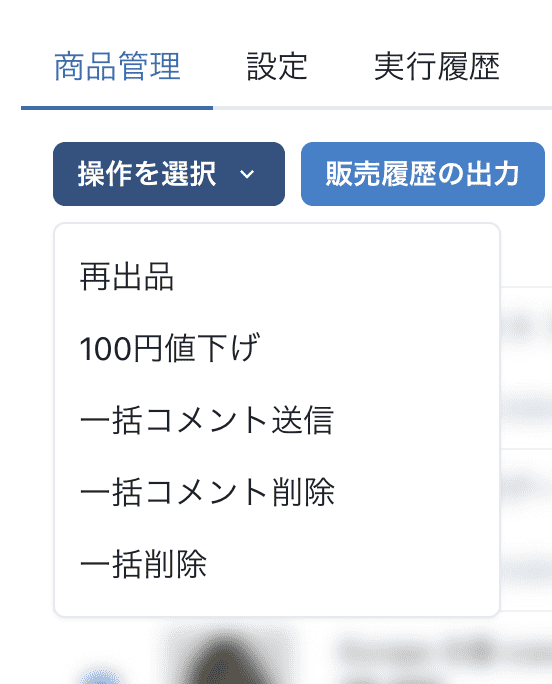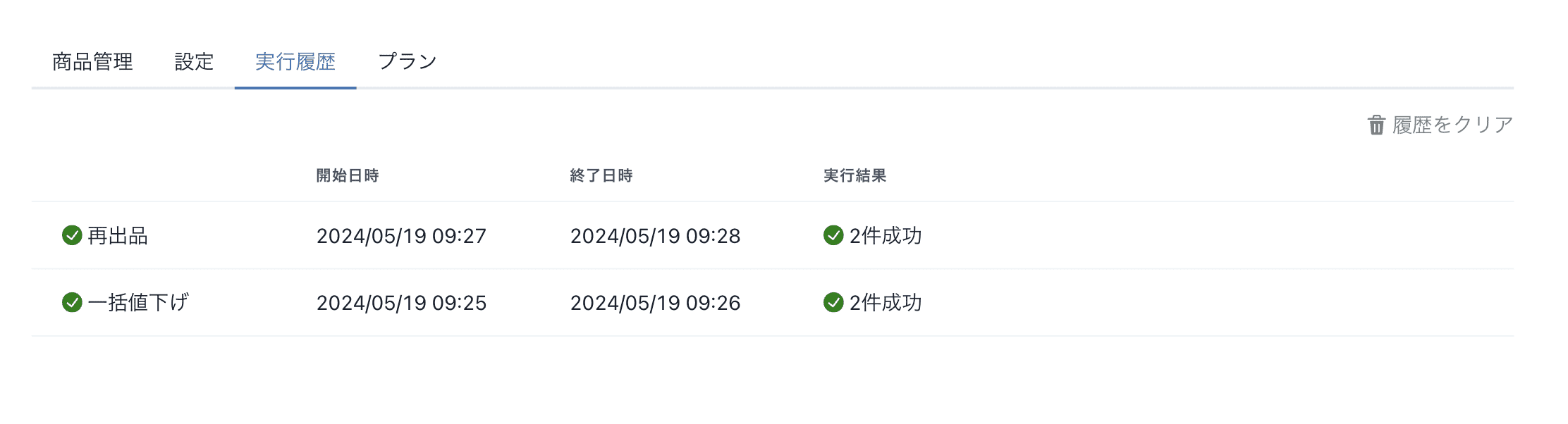 管理画面に一括値下げ、再出品、一括コメント送信の実行履歴を表示するようにしました。