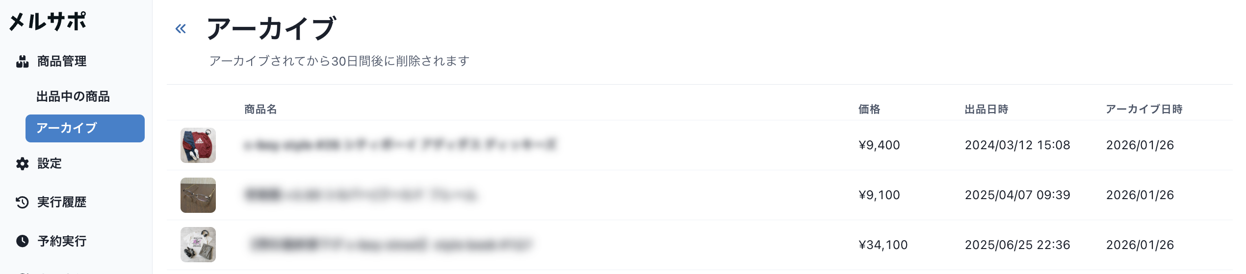 アーカイブはメルサポ管理画面の「商品管理 > アーカイブ」から確認できます。