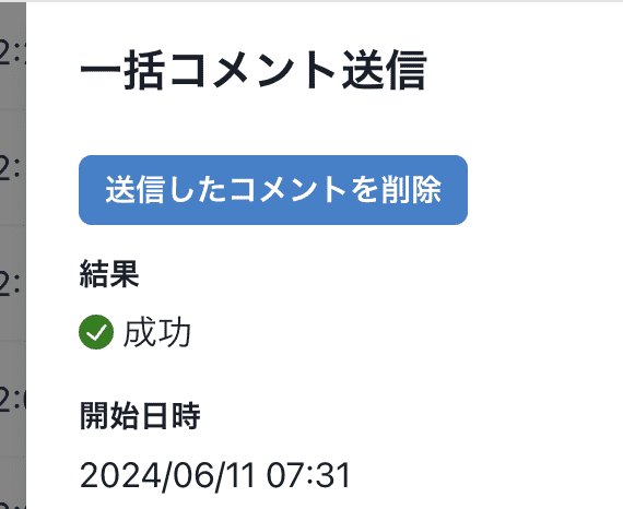「実行履歴」タブの一括コメント送信の履歴から、一括で送信したコメントを削除することもできます。