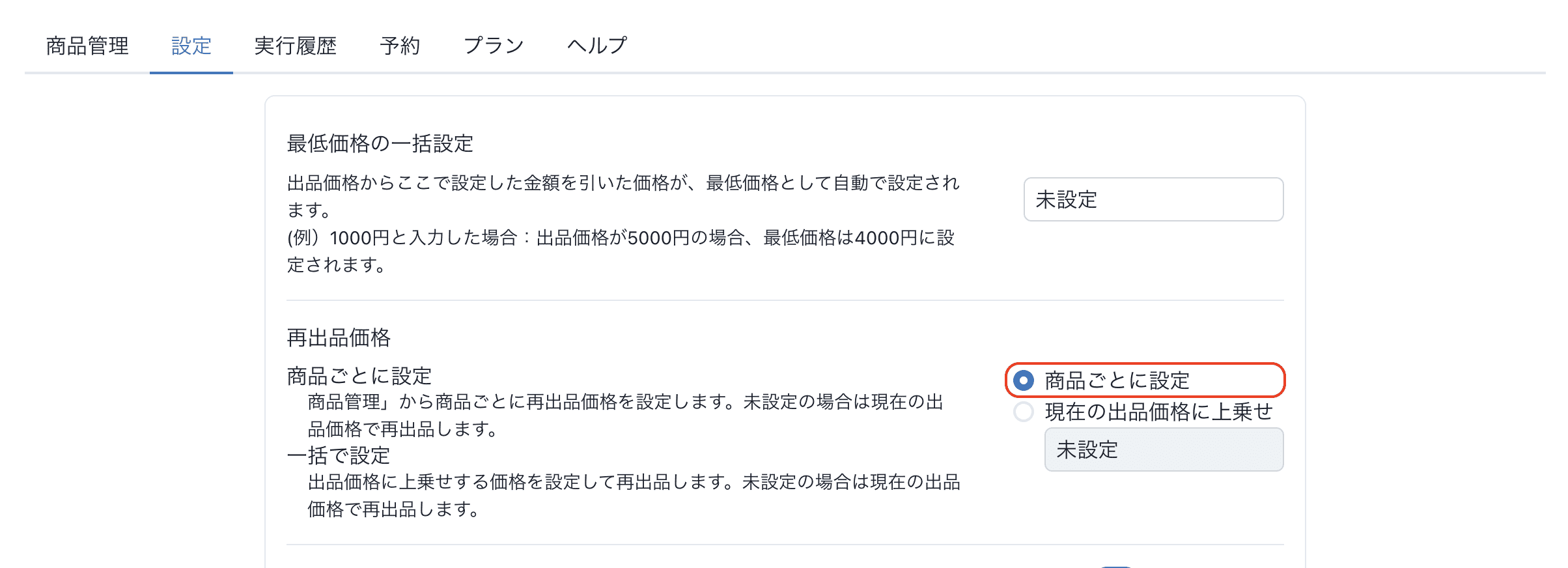 出品中の商品を取り込むときに最低価格を自動で設定できるようになりました。